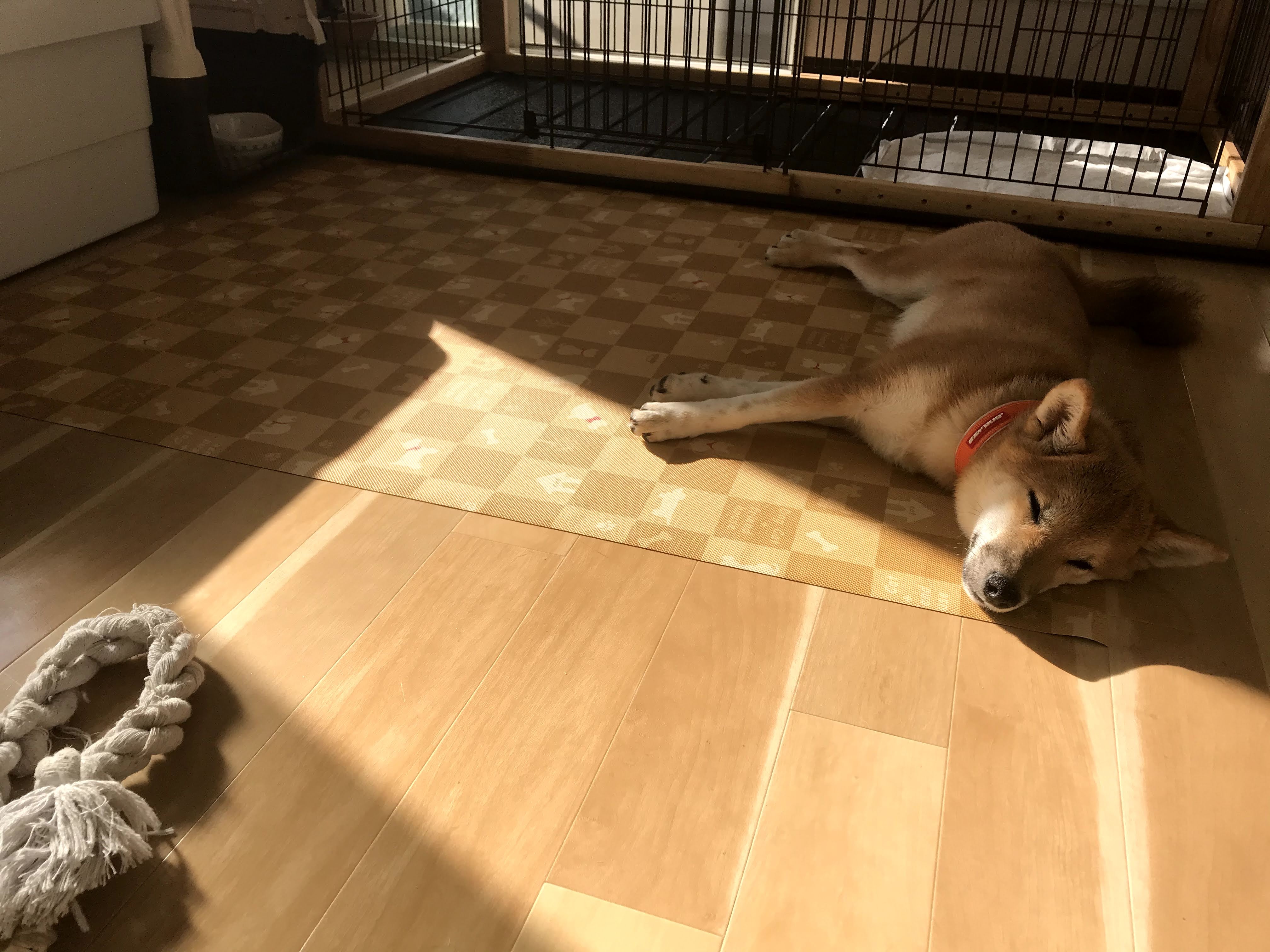 というわけで現状としては、90×120cmの滑り止めマットを1枚だけ敷いて、そこで愛犬の動きを見守ることにしました。マット以外の部分はフローリングですが、何もないよりはマシかな、と。滑らないのが気に入ったのか、愛犬もマットの上を好んでくれていますし。